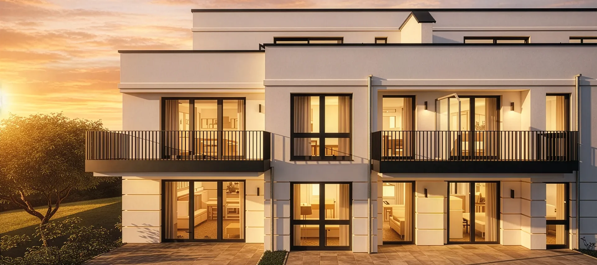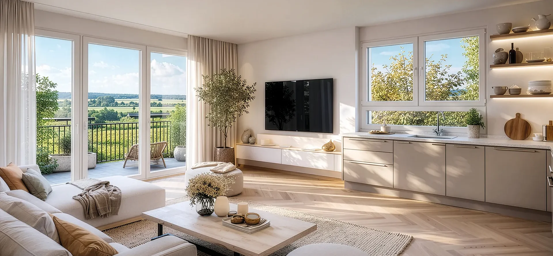 Großzügige Fensterflächen sorgen für viel Tageslicht und eine helle, offene Wohnatmosphäre. Hochwertige Materialien und moderne Gebäudetechnik stehen zugleich für Komfort, Effizienz und nachhaltiges Wohnen.